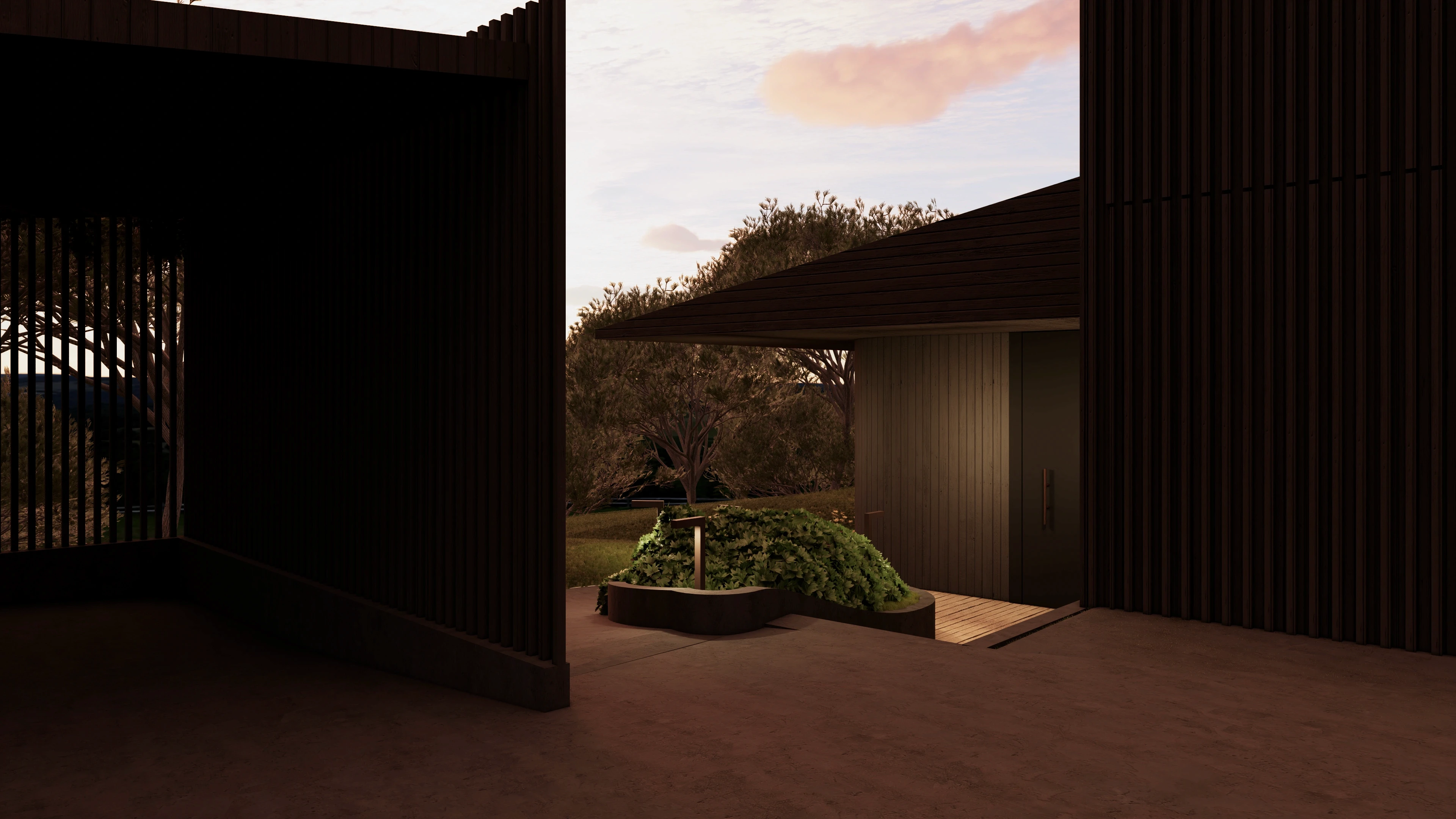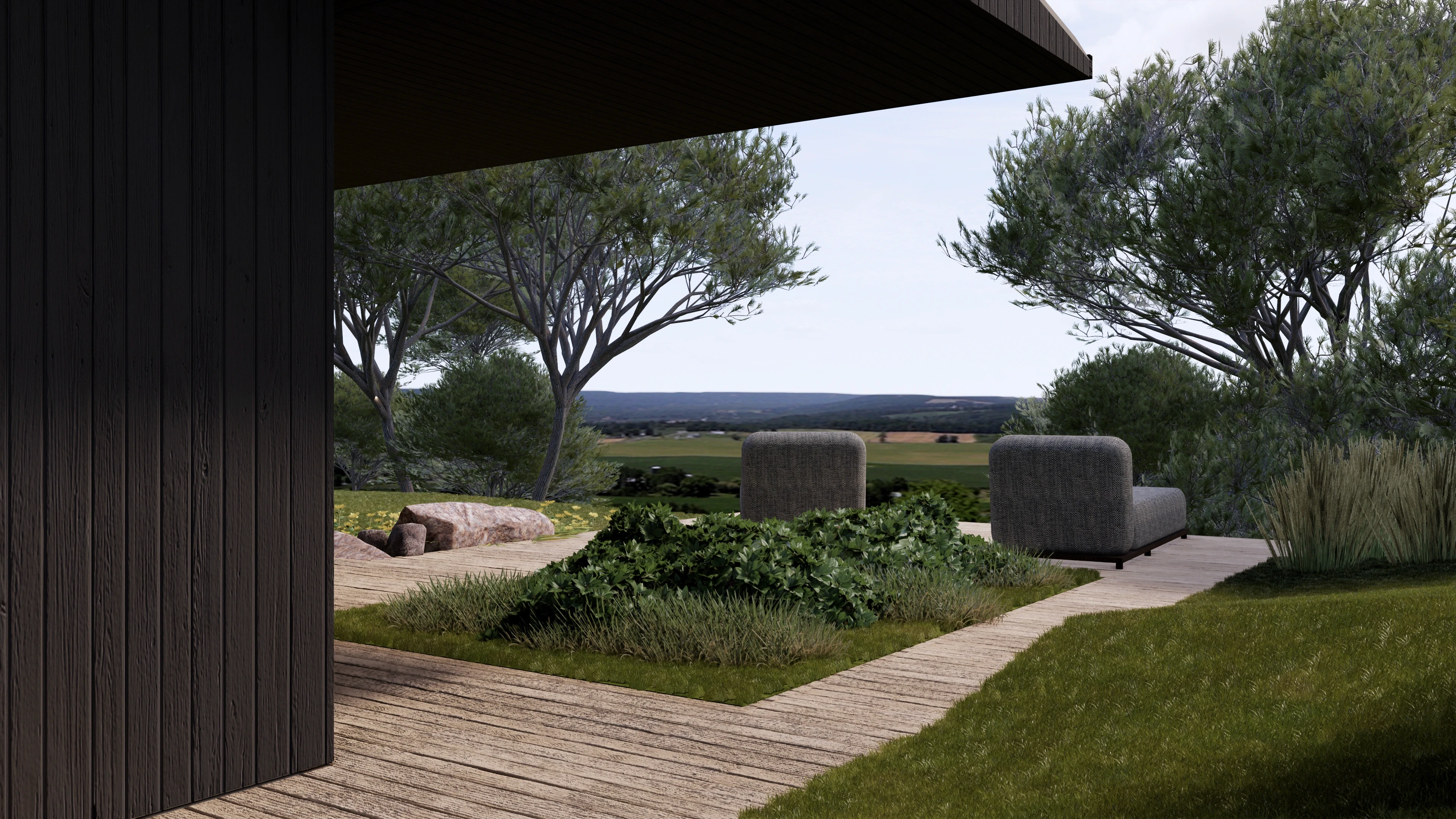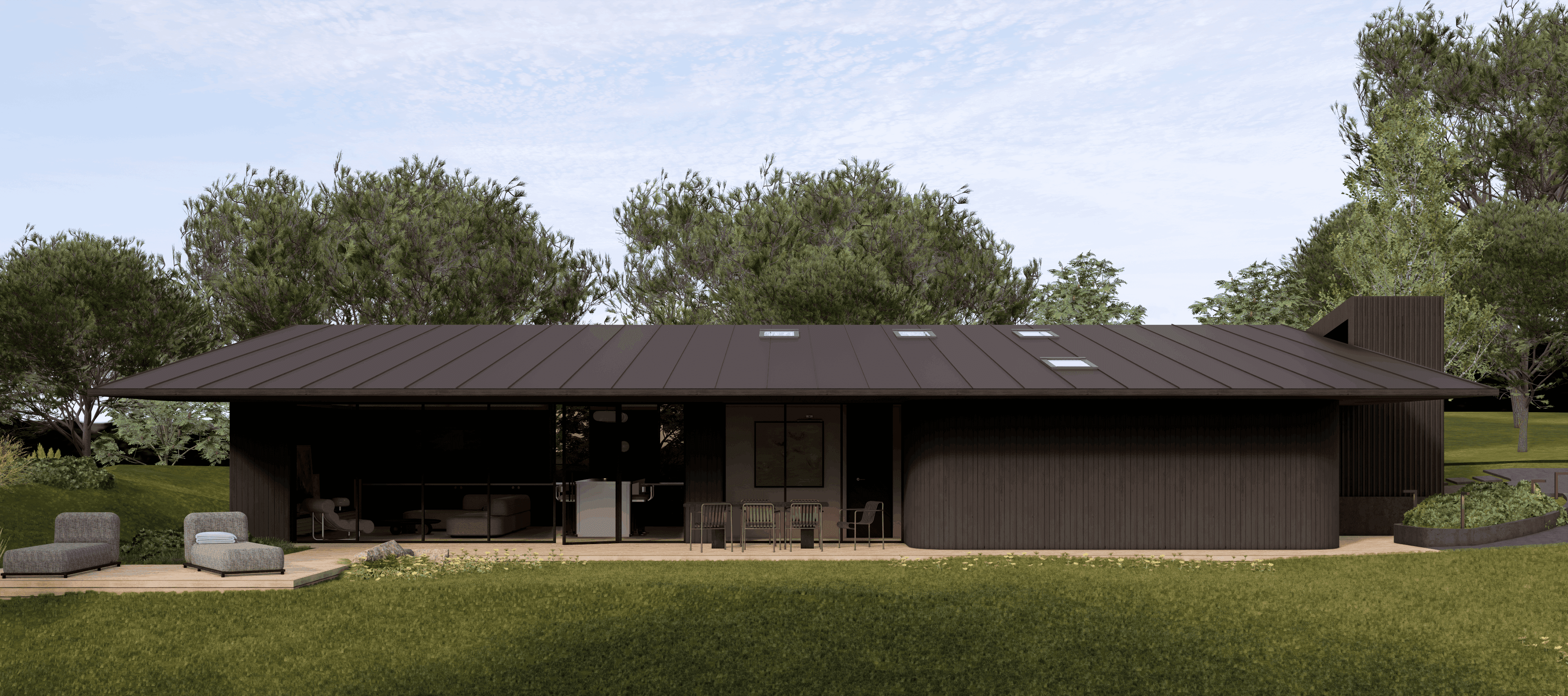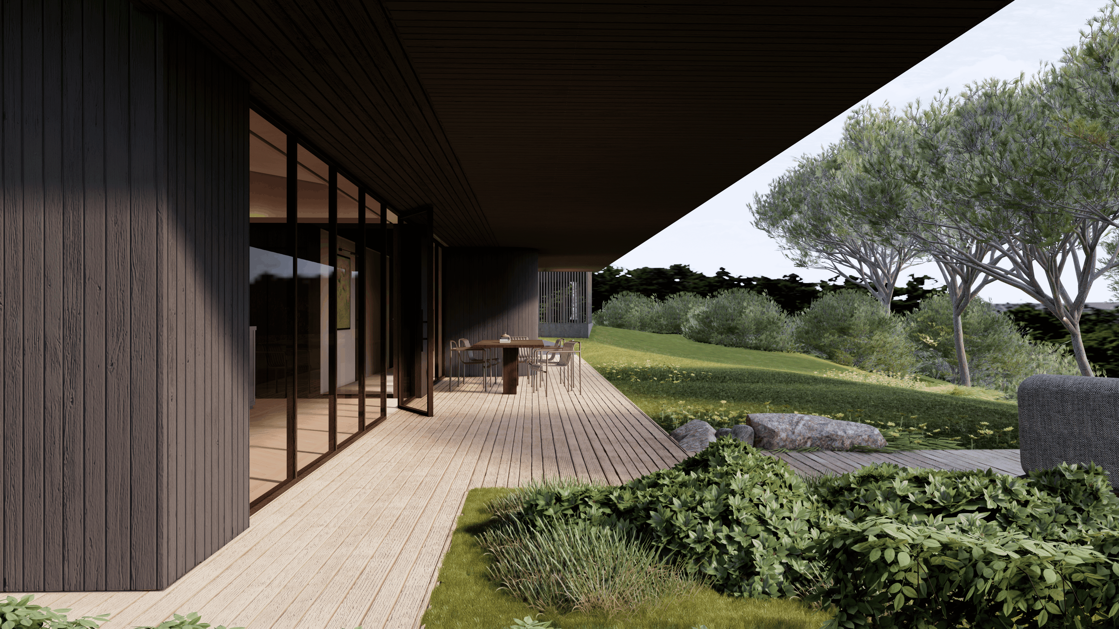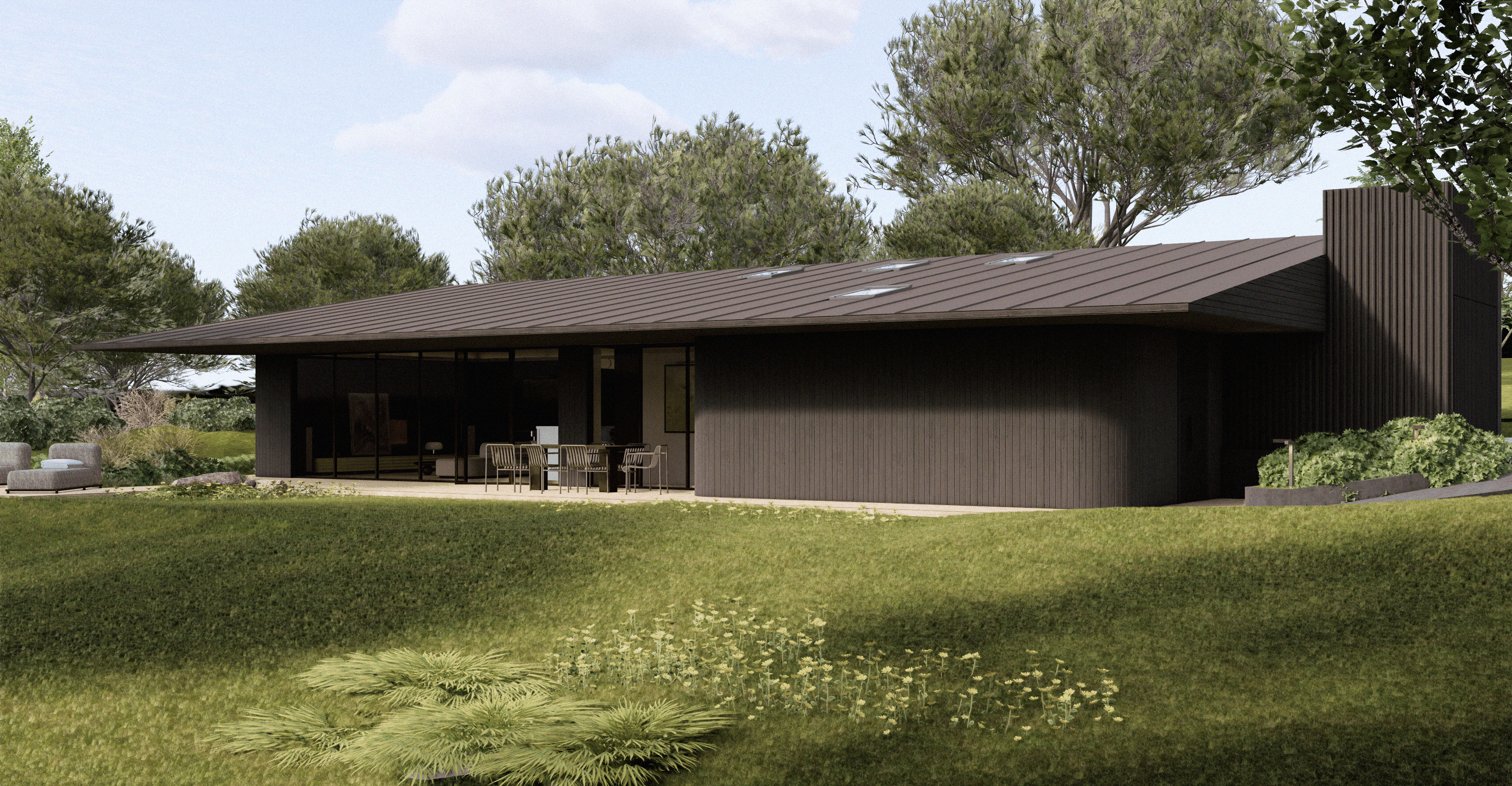 Šlaito viršuje projektuojamas namas natūraliai įsilieja į reljefą ir atveria įspūdinga panoramą. Naturalios formos tūris ir aiški šlaitinio stogo struktūra kuria santūrią estetiką, kuri netrukdo aplinkos vaizdams, o tik juos papildo. Namas suplanuotas itin funkcionaliai – erdvės logiškai išdėstytos pagal gyvensenos ritmą, užtikrinant patogų kasdienį naudojimą. Tamsaus medžio fasadai ir prailgintos pastogės ne tik pabrėžia architektūros vientisumą, bet ir saugo nuo kaitros bei kritulių, leidžiant mėgautis gamtos artumu visais metų laikais.